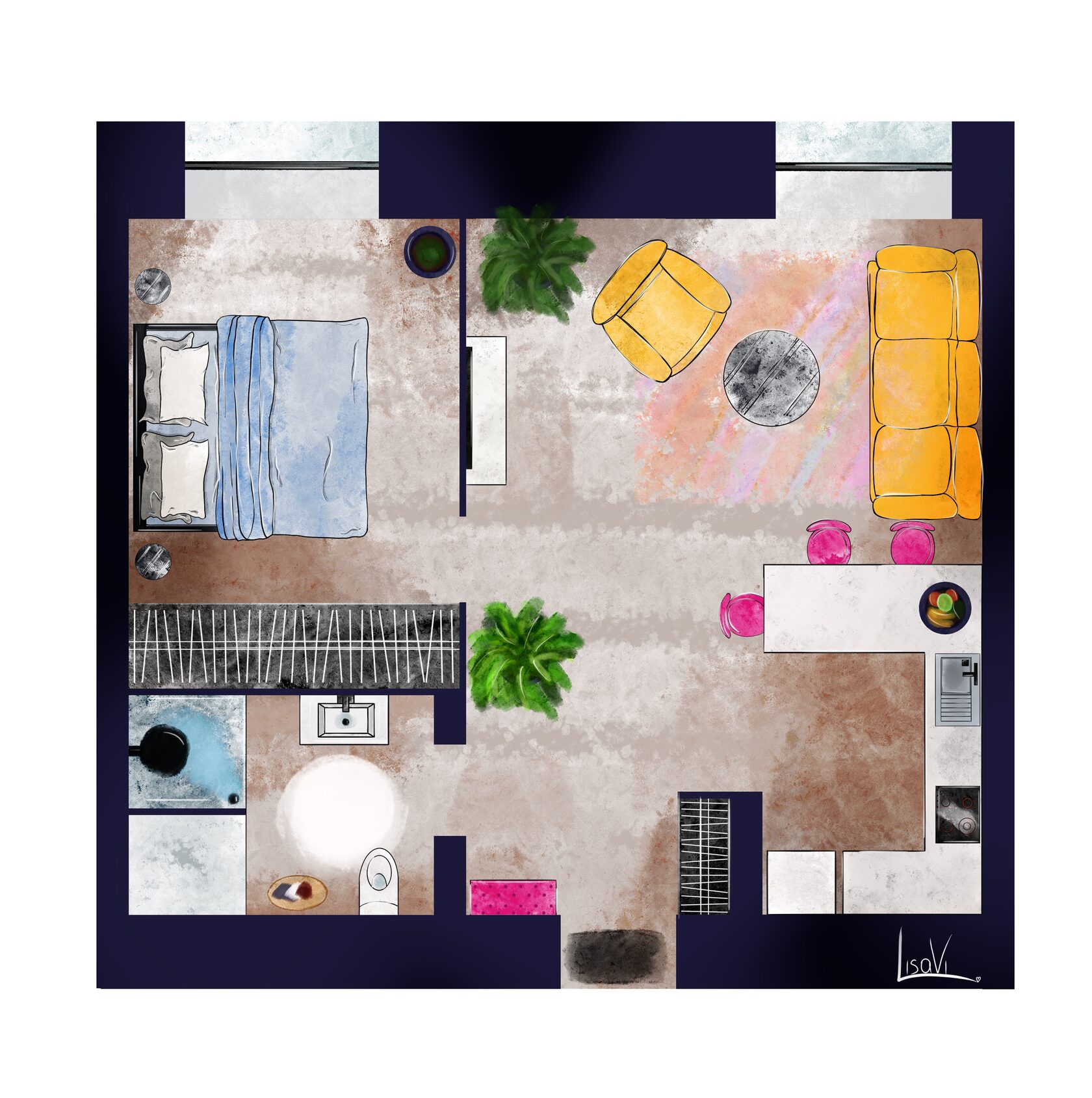 На кухне использовали барную стойку, чтобы не загружать гостиную комнату мебелью. Яркие откосы задают позитивное настроение на весь день.
